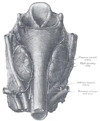 The relationship between the recurrent laryngeal nerve and inferior thyroid artery is highly variable.[2] The recurrent laryngeal nerve passes upward generally behind, but occasionally in front of, the inferior thyroid artery. This makes it vulnerable to injury during surgery that involves ligating the inferior thyroid artery, such as excision of the lower pole of the thyroid gland. Also as the parathyroid is mainly supplied by inferior thyroid artery accidental ligation during thyroidectomy can cause hypoparathyroidism.