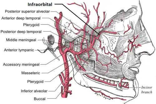 The infraorbital artery is a small[1] artery in the head that arises from the maxillary artery and passes through the inferior orbital fissure to enter the orbit, then passes forward along the floor of the orbit, finally exiting the orbit through the infraorbital foramen to reach the face.