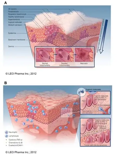{{cite journal}}: CS1 maint: unflagged free DOI (link) - ↑ Freiberger S (2015). "Ingenol Mebutate Signals via PKC/MEK/ERK in Keratinocytes and Induces Interleukin Decoy Receptors IL1R2 and IL13RA2". Molecular Cancer Therapeutics. 14 (9): 2132–2142. doi:10.1158/1535-7163.mct-15-0023-t. PMID 26116359. Archived from the original on 2020-08-05. Retrieved 2020-12-27.