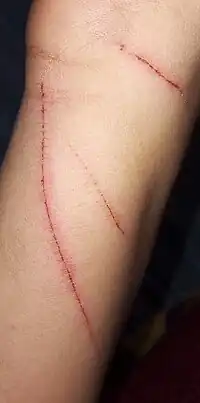 Injuries often cause psychological harm in addition to physical harm. Traumatic injuries are associated with psychological trauma and distress, and some victims of traumatic injuries will display symptoms of post-traumatic stress disorder during and after the recovery of the injury. The specific symptoms and their triggers vary depending on the nature of the injury.[64] Body image and self-esteem can also be affected by injury. Injuries that cause permanent disabilities, such as spinal cord injuries, can have severe effects on self-esteem.[65][66] Disfiguring injuries can negatively affect body image, leading to a lower quality of life. Burn injuries in particular can cause dramatic changes in a person's appearance that may negatively affect body image.[67][68][69]