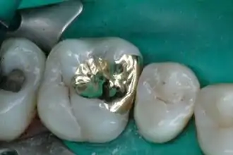 When decay or fracture incorporate areas of a tooth that make amalgam or composite restorations inadequate, such as cuspal fracture or remaining tooth structure that undermines perimeter walls of a tooth, an onlay might be indicated.[13] Similar to an inlay, an onlay is an indirect restoration which incorporates a cusp or cusps by covering or onlaying the missing cusps. All of the benefits of an inlay are present in the onlay restoration. The onlay allows for conservation of tooth structure when the only alternative is to totally eliminate cusps and perimeter walls for restoration with a crown. Just as inlays, onlays are fabricated outside of the mouth and are typically made out of gold or porcelain. Gold restorations have been around for many years and have an excellent track record. In recent years, newer types of porcelains have been developed that seem to rival the longevity of gold. If the onlay or inlay is made in a dental laboratory, a temporary is fabricated while the restoration is custom-made for the patient. A return visit is then required to fit the final prosthesis. Inlays and onlays may also be fabricated out of porcelain and delivered the same day utilizing techniques and technologies relating to CAD/CAM dentistry.[14][15]