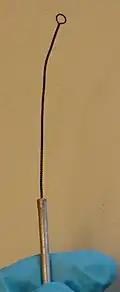 The tool consists of a thin handle with a loop about 5 mm wide or smaller at the end. It was originally made of twisted metal wire (such as platinum, tungsten or nichrome), but disposable molded plastic versions are now common. The size of the loop determines the volume of liquid an inoculation loop can transfer. An early report of the use of an inoculation loop as an analytical tool was by O'Sullivan et al.[3] in a 1960 published protocol developed to improve methods for culturing urine samples. A 3mm diameter loop was used to deliver a consistent volume of urine for analysis. Loops can now be purchased to transfer volumes ranging from 1-10 microliters, though pipettes have replaced inoculation loops as more reliable tools to deliver small volumes of liquid.