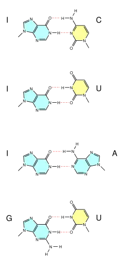 However, inosine pairs preferentially with cytosine (C) and its introduction to RNA, e.g. by the action of ADARs, thereby destabilizes double-stranded RNA by changing AU base-pairs to IU mismatches.[17]