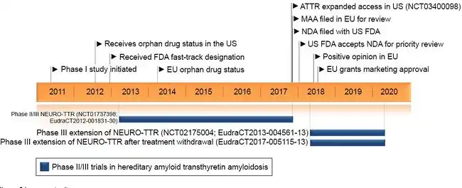 The FDA approved inotersen based on evidence from one clinical trial (Trial 1/NCT01737398) that included 172 patients with hereditary transthyretin-mediated amyloidosis.[2] The trial was conducted at 24 sites in Australia, Europe, South America, and the United States.[2]