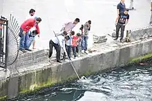 In emergency situations in which lifeguards or other trained personnel are not present, it is advisable to reach for the victim from land with your hand or a long stick, row to them in a boat, or throw them a flotation device, but not to enter the water (often pithily summarised as "Reach or throw, don't go.")[5] While the instinctive reaction to drowning is taking place, the victim will latch onto any nearby solid objects in attempts to get air, which can result in the drowning of a would-be rescuer as well as (or instead of) the original victim.[6] This "aquatic victim-instead-of-rescuer scenario" is common[7] and killed 103 would-be rescuers in Australia between 1992 and 2010, and another 81 people in New Zealand between 1980 and 2012.[8] A study of drownings in Turkey found 88 cases in which 114 would-be rescuers drowned during their attempts to rescue a primary drowning victim.[9]