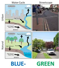 According to Australia's Commonwealth Scientific and Industrial Research Organisation (CSIRO), IUWM requires the management of the urban water cycle in coordination with the hydrological water cycle which are significantly altered by urban landscapes and its correlation to increasing demand. Under natural conditions the water inputs at any point in the system are precipitation and overland flows; while the outputs are via surface flows, evapo-transpiration and groundwater recharge. The large volumes of piped water introduced with the change to an urban setting and the introduction of vast impervious areas strongly impact the water balance, increasing in-flows and dramatically altering the out-flow components.[2]