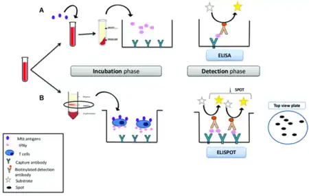 ![]() a) Mycobacterium tuberculosis IFN-γ-release assay b) the ELISPOT method[1] | |