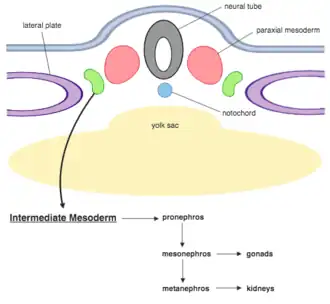 The intermediate mesoderm or intermediate mesenchyme is a narrow section of the mesoderm (the middle germ layer) located between the paraxial mesoderm and the lateral plate mesoderm of the developing embryo.[1] The intermediate mesoderm develops into vital parts of the urogenital system (kidneys, gonads and respective tracts).