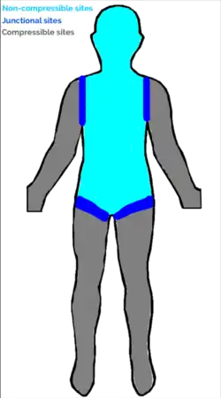 Internal bleeding where the torso meets the extremities ("junctional sites" such as the axilla or groin) cannot be controlled with a tourniquet; however there is an FDA approved device known as an Abdominal Aortic and Junctional Tourniquet (AAJT) designed for proximal aortic control, although very few studies examining its use have been published.[14][15][16][17][18][19] For bleeding at junctional sites, a dressing with a blood clotting agent (hemostatic dressing) should be applied.[4]