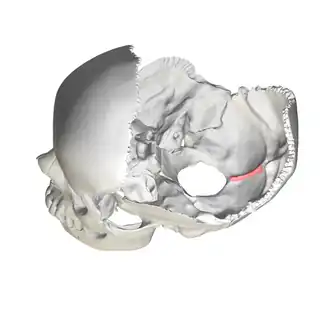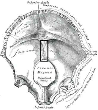 ![]() Human skull side view (parietal bones removed). Position of internal occipital crest shown in red. | |