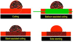 From the early 2000s, intracranial stents were used to prevent the coils inside the aneurysmal sac from protruding into the parent artery.[11][12] Flow diversion devices were later developed, with the function of reconstructing the vessel's normal anatomy without directly closing the aneurysm neck and therefore preserving side branches and preventing ischemia.[13] The sole stenting[14] procedure involves the insertion of a stent only (without any coils) into the vessel that has an aneurysm.[15]