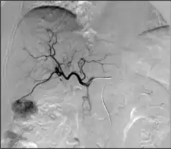 Arteriovenous malformations (AVMs) are abnormal blood vessel structures in which an artery connects to a vein via an abnormal channel. This creates a high flow system that puts the vessel at risk of rupture. Ruptured AVMs require emergency management of the patient; unruptured AVMs require expert consultation to discuss the risks and benefits of treatment.[36] Current treatment options include conservative management, surgical resection, stereotactic radiosurgery, endovascular embolization, or combinations of these treatments.[37] Endovascular embolization is a technique used by neurointerventionalists in which particles, glue, or coils are lodged inside the AVM to prevent blood flow through the abnormal channel. During this treatment, an interventional radiologist guides a catheter through a blood vessel accessed from the patient's leg to the site of the AVM. The particles, glue, or coils induce clotting within the malformation, which reduces the risk of rupture.[38]