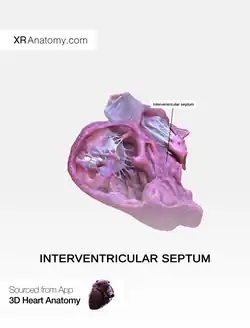 The interventricular septum is directed obliquely backward to the right and curved with the convexity toward the right ventricle; its margins correspond with the anterior and posterior interventricular sulci. The lower part of the septum, which is the major part, is thick and muscular, and its much smaller upper part is thin and membraneous.[1]