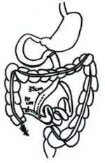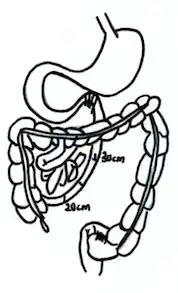 The intestinal bypass surgery, as the name suggests, anastomoses 14 inches of the proximal duodenum, the part of the small intestine closest to the stomach, to the 4 inches of the distal ileum, the part of the small intestine closest to large intestines.[5] This creates a blind loop and bypasses nearly 85-90 % of the small intestine.[5] As a corollary, the absorption of nutrients is greatly reduced, and thus lead to apparent weight reduction.
