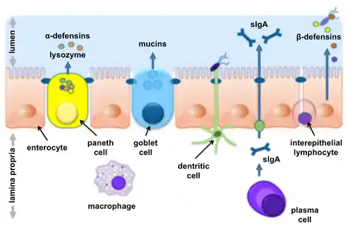 Secretory immunoglobulin A (sIgA) is produced by plasma cells in the lamina propria and transported into the lumen by intestinal epithelial cells.[7] SIgA blocks epithelial-specific receptors on pathogens, thereby preventing their attachment to epithelial cells.