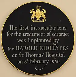 Johan Virgilius Casaamata (1741–1807) of Dresden had unsuccessfully attempted to place a glass intraocular lens after cataract surgery by January 1797.[35] When writing his memoirs in the 1790s, Giacomo Casanova likely heard of Casaamata's attempt, because Casanova falsely claimed that oculist Felice Tadini told him the idea of intraocular lenses in Warsaw in 1766, but Casanova's claim is false, because Tadini was in Constantinople in 1766.[35] Sir Harold Ridley was the first to successfully implant an intraocular lens on 29 November 1949, at St Thomas' Hospital at London.[36] That lens was manufactured by the Rayner company of Brighton, East Sussex, England from Perspex CQ polymethylmethacrylate (PMMA) made by ICI (Imperial Chemical Industries). Ridley had observed that Royal Air Force pilots who sustained eye injuries during World War II involving PMMA windshield material did not show any rejection or foreign body reaction, and deduced that the transparent material was inert and useful for implantation in the eye.[37]