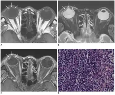 | a-c)Posttransplantation intraocular lymphoma- MR images showing smooth, undulating soft-tissue lesion in iris and anterior chamber d)photomicrograph consistent with diffuse large B-cell lymphoma | |