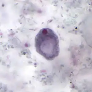 The cysts are 8–10 micrometres in diameter, with a thick wall and a large glycogen vacuole that stains darkly with iodine. Usually harmless, it may cause amebiasis in immunologically compromised individuals. [5][6] As the second form of I. butschlii, cysts have an oval shaped- single nucleus with a prominent nuclear endosome. This form is also large, single, glycogen-filled vacuole called iodinophilous vacuole (glycogen stains with iodine). Cysts are the infective stage of I. buetschlii. Unlike trophozoites, cysts are often found in formed stools.[4]