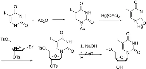- ↑ GB 1024156, "Process for the preparation of 5-iodo-2'-desoxy-uridine", published 1966-03-30, assigned to Roussel-Uclaf