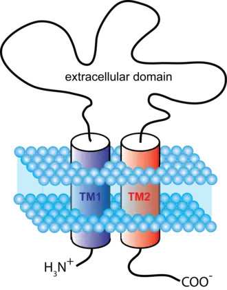 The cys-loop receptors are named after a characteristic loop formed by a disulfide bond between two cysteine residues in the N terminal extracellular domain. They are part of a larger family of pentameric ligand-gated ion channels that usually lack this disulfide bond, hence the tentative name "Pro-loop receptors".[4][5] A binding site in the extracellular N-terminal ligand-binding domain gives them receptor specificity for (1) acetylcholine (AcCh), (2) serotonin, (3) glycine, (4) glutamate and (5) γ-aminobutyric acid (GABA) in vertebrates. The receptors are subdivided with respect to the type of ion that they conduct (anionic or cationic) and further into families defined by the endogenous ligand. They are usually pentameric with each subunit containing 4 transmembrane helices constituting the transmembrane domain, and a beta sheet sandwich type, extracellular, N terminal, ligand binding domain.[6] Some also contain an intracellular domain like shown in the image.