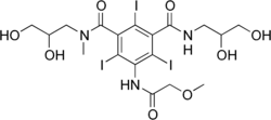 Iopromide is an iodinated contrast medium for X-ray imaging. It is marketed under the name Ultravist which is produced by Bayer Healthcare. It is a low osmolar, non-ionic contrast agent for intravascular use; i.e., it is injected into blood vessels.[1]