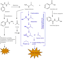 Iproniazid is metabolized in the body. Iproniazid is converted to isopropyl hydrazine and isonicotinic acid in an initial hydrolysis reaction. Isopropyl hydrazine can either be released in the blood or it can be metabolically activated by microsomal CYP450 enzymes.[19] This oxidation of isopropyl hydrazine is a toxification reaction that eventually can lead to the formation of an alkylating agent: the isopropyl radical.[3] Hepatic necrosis was found in rats with doses as low as 10 mg/kg.[19]