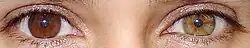 Heterochromia (also known as a heterochromia iridis or heterochromia iridum) is an ocular condition in which one iris is a different color from the other iris (complete heterochromia), or where the part of one iris is a different color from the remainder (partial heterochromia or sectoral heterochromia). Uncommon in humans, it is often an indicator of ocular disease, such as chronic iritis or diffuse iris melanoma, but may also occur as a normal variant. Sectors or patches of strikingly different colors in the same iris are less common. Anastasius the First was dubbed dikoros (having two irises) for his patent heterochromia since his right iris had a darker color than the left one.[10][11]