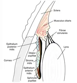The back surface is covered by a heavily pigmented epithelial layer that is two cells thick (the iris pigment epithelium), but the front surface has no epithelium. This anterior surface projects as the dilator muscles. The high pigment content blocks light from passing through the iris to the retina, restricting it to the pupil.[3] The outer edge of the iris, known as the root, is attached to the sclera and the anterior ciliary body. The iris and ciliary body together are known as the anterior uvea. Just in front of the root of the iris is the region referred to as the trabecular meshwork, through which the aqueous humour constantly drains out of the eye, with the result that diseases of the iris often have important effects on intraocular pressure and indirectly on vision. The iris along with the anterior ciliary body provide a secondary pathway for aqueous humour to drain from the eye.