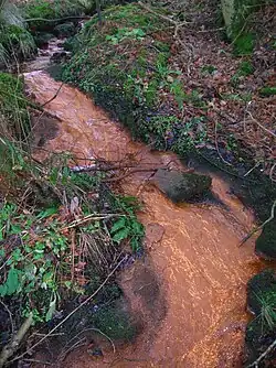 A similar reaction may form black deposits of manganese dioxide from dissolved manganese but is less common because of the relative abundance of iron (5.4%) in comparison to manganese (0.1%) in average soils.[5] The sulfurous smell of rot or decay sometimes associated with iron-oxidizing bacteria results from the enzymatic conversion of soil sulfates to volatile hydrogen sulfide as an alternative source of oxygen in anaerobic water.[6]