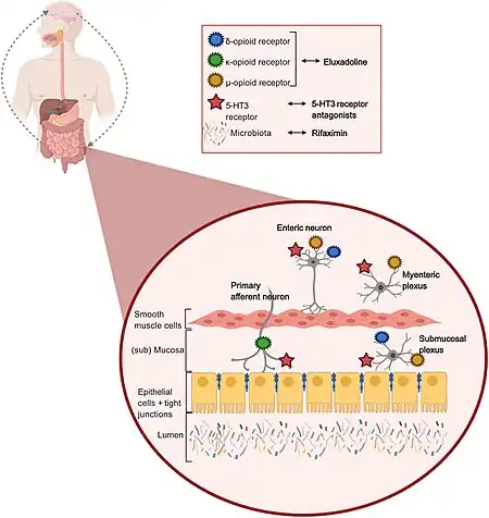 - ↑ Colomier, Esther; Algera, Joost; Melchior, Chloé (18 February 2021). "Pharmacological Therapies and Their Clinical Targets in Irritable Bowel Syndrome With Diarrhea". Frontiers in Pharmacology. 11. doi:10.3389/fphar.2020.629026. ISSN 1663-9812.