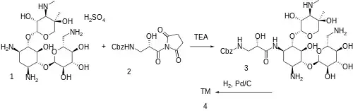 Isepamicin can be synthesized by derivatization of gentamicin B (1) with benzyl N-[(2S)-3-(2,5-dioxopyrrolidin-1-yl)-2-hydroxy-3-oxopropyl]carbamate (2), followed by deprotection.[3][4][5][6]