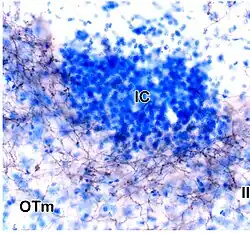 ![]() Islands of Calleja of rat brain stained in blue. Denoted under IC abbreviation. | |