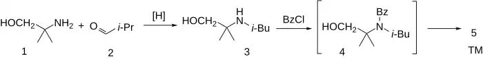 The reductive amination between aminomethyl propanol (1) and isobutanal [78-84-2] (2) afforded N-Isobutyl-1,1-dimethyl-2-hydroxyethanamine, CID:18315986 (3). Acylation of the amine with benzoyl chloride [98-88-4] hypothetically goes initially to the amide (4'). The acid catalysis used in the reaction leads to an N to O acyl migration to afford isobucaine (5).
