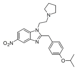 Isotonitazepyne (N-pyrrolidino-isotonitazene, NPI) is a benzimidazole derivative with potent opioid effects, which has been sold as a designer drug over the internet. Its in vitro potency is approximately 1000 times that of morphine.[1] One sample of counterfeit oxycodone pills were found to contain between 3.3 and 3.5 mg of NPI per pill and no oxycodone.[2]