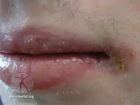 The most common side effects are mucocutaneous: dry lips, skin and nose. Other common mucocutaneous side effects are inflammation and chapping of the lips (cheilitis), redness of the skin (erythema), rashes, peeling, eczema (dermatitis), itching (pruritus) and nose bleeds (epistaxis).[35] Absence of dryness of the lips is considered an indication of non-compliance with treatment (not taking the drug as advised), as it occurs in almost all people who take it.[35]