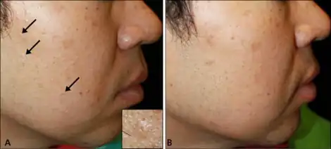 - ↑ Strauss JS, Krowchuk DP, Leyden JJ, Lucky AW, Shalita AR, Siegfried EC, Thiboutot DM, Van Voorhees AS, Beutner KA, Sieck CK, Bhushan R (April 2007). "Guidelines of care for acne vulgaris management". Journal of the American Academy of Dermatology. 56 (4): 651–63. doi:10.1016/j.jaad.2006.08.048. PMID 17276540.