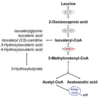 Elevated 3-hydroxyisovaleric acid is a clinical biomarker of biotin deficiency. Without biotin, leucine and isoleucine cannot be metabolized normally and results in elevated synthesis of isovaleric acid and consequently 3-hydroxyisovaleric acid, isovalerylglycine, and other isovaleric acid metabolites as well. Elevated serum 3-hydroxyisovaleric acid concentrations can be caused by supplementation with 3-hydroxyisovaleric acid, genetic conditions, or dietary deficiency of biotin. Some patients with isovaleric acidemia may benefit from supplemental biotin.[9] Biotin deficiency on its own can have severe physiological and cognitive consequences[10] that closely resemble symptoms of organic acidemias.