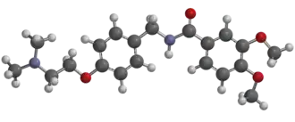Itopride (INN; brand name Ganaton) is a prokinetic benzamide derivative. These drugs inhibit dopamine and acetylcholine esterase enzyme and have a gastrokinetic effect.[3] Itopride is indicated for the treatment of functional dyspepsia and other gastrointestinal conditions.[4] It is a combined D2 receptor antagonist and acetylcholinesterase inhibitor.[5][6] Itopride is the dimethoxy analog of trimethobenzamide.