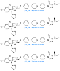 Itraconazole molecule has three chiral carbons. The two chiral centers in the dioxolane ring are fixed in relation to one another, and the triazolomethylene and aryloxymethylene dioxolane-ring substituents are always cis to each other. The clinical formulation is a 1:1:1:1 mixture of four stereoisomers (two enantiomeric pairs).[35][36][37]