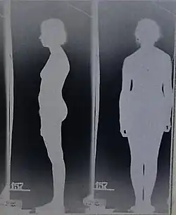 During the 1940s–1960s, nude photographs were routinely taken of incoming freshmen at elite colleges in the United States, such as the Ivy Leagues and Seven Sisters schools.[1][2][3][4] Purportedly taken to assess the posture and health of the students, the bulk of the photographs were produced by W. H. Sheldon, a psychologist and eugenicist who believed non-white races were intellectually stunted. Sheldon developed a theory that measuring a human body could predict the subject's intelligence, temperament, and moral worth.[1] The inspiration to take mass photos for his research came from the founder of eugenics, Francis Galton, who proposed such a photo archive for the British population.[1]