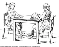 In the early 1900s, posture became even more important in American culture, with the formation of the American Posture League, contests like "Miss Perfect Posture", and college campuses with "posture police" that tagged students who were not walking or standing straight.[4][11] In this atmosphere, it was common for public primary schools to run postural correction programs.[11][12] College posture photo practices increased, and by 1925, most schools adopted full-body nudes, as recommended by the Boston Normal School of Gymnastics, which later became Wellesley's Dept. of Physical Education.[5][15]