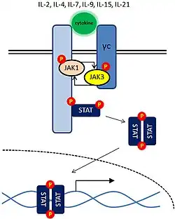 Janus kinase 3 inhibitors work by inhibiting the action of the enzyme Janus kinase 3, thereby interfering with the JAK-STAT signaling pathway. JAK3 is required for signaling by cytokines through the common γ chain of the interleukin receptors for IL-2, IL-4, IL-7, IL-9, IL-15, and IL-21.[4] However, JAK1 is also required as the two kinases cooperate for signaling.[5] This signaling process leads to phosphorylation and dimerization of the adaptor proteins STAT. When activated, they translocate into the nucleus, where they modulate gene transcription.[6] By selectively inhibiting JAK3, downward signaling can be blocked.