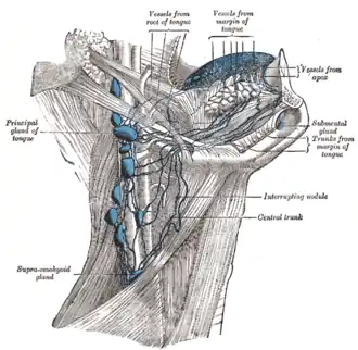 ![]() Lymphatics of the tongue (jugulo-omohyoid lymph node visible but not labeled) | |