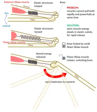 Grasshoppers use elastic energy storage to increase jumping distance. Although power output is a principal determinant of jump distance, physiological constraints limit muscle power to approximately 375 Watts per kilogram of muscle.[2] To overcome this limitation, grasshoppers anchor their legs via an internal "catch mechanism" while their muscles stretch an elastic apodeme (similar to a vertebrate tendon). When the catch is released, the apodeme rapidly releases its energy. Because the apodeme releases energy more quickly than muscle, its power output far exceeds that of the muscle that produced the energy.[3][4][5]
