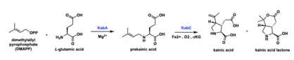 The first step of the pathway involves the N-prenyltransferase, KabA, which allows for the prenylation of L-glutamic acid with dimethylallyl pyrophosphate (DMAPP) to form the intermediate N-dimethylallyl-l-glutamic acid (prekainic acid). KabC then catalyzes the stereocontrolled formation of the trisubstituted pyrrolidine ring, taking prekainic acid to the final kainic acid. KabC was also able to produce another kainic acid isomer, kainic acid lactone.