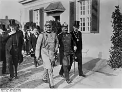 Opening of the Kaiser-Wilhelm-Institut in Berlin-Dahlem, 1913. From right: Adolf von Harnack, Friedrich von Ilberg, Kaiser Wilhelm II, Carl Neuberg, August von Trott zu Solz.