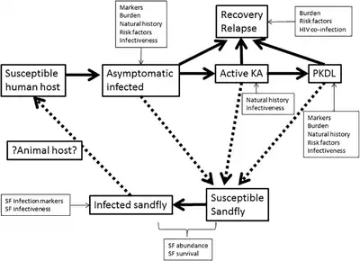 - ↑ 7.0 7.1 7.2 7.3 7.4 7.5 7.6 7.7 Hirve, S; Boelaert, M; Matlashewski, G; Mondal, D; Arana, B; Kroeger, A; Olliaro, P (August 2016). "Transmission Dynamics of Visceral Leishmaniasis in the Indian Subcontinent – A Systematic Literature Review". PLOS Neglected Tropical Diseases. 10 (8): e0004896. doi:10.1371/journal.pntd.0004896. PMC 4973965. PMID 27490264.