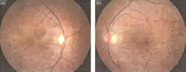 | a and b) Funduscopic examination showing atypical pigmentary retinitis. | |