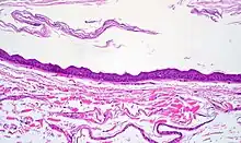 Keratocysts have a stratified squamous epithelial wall without sebaceous lobules.[2]