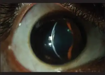 | Keratoglobus with healed hydrops ( tear in the Descemet's membrane is visible) | |